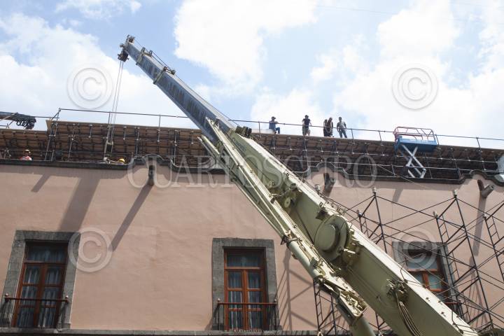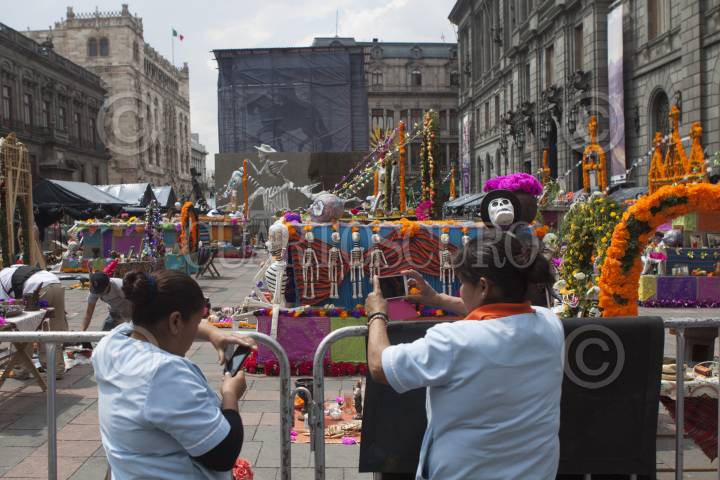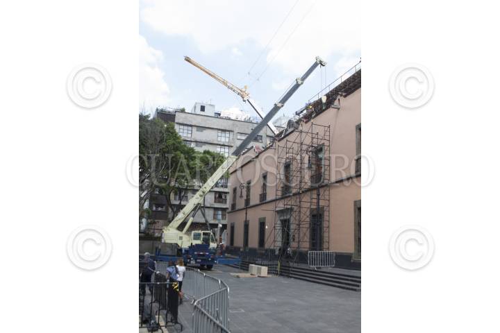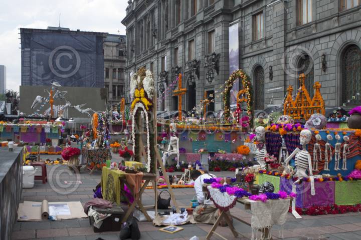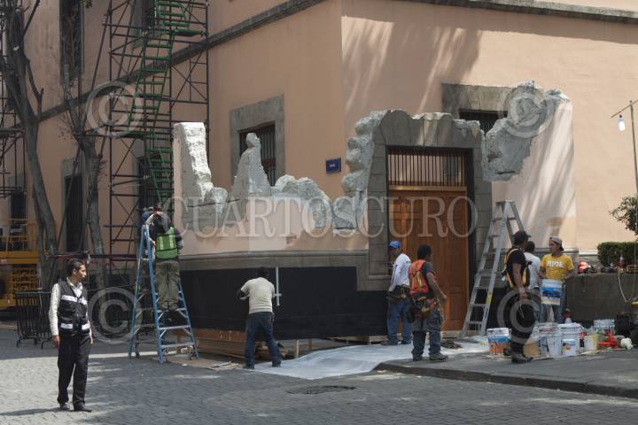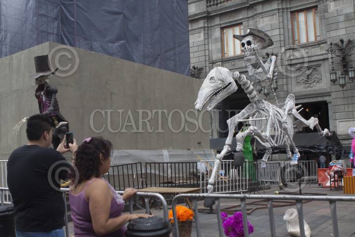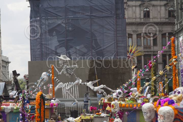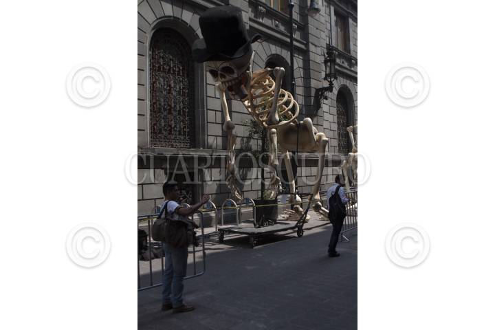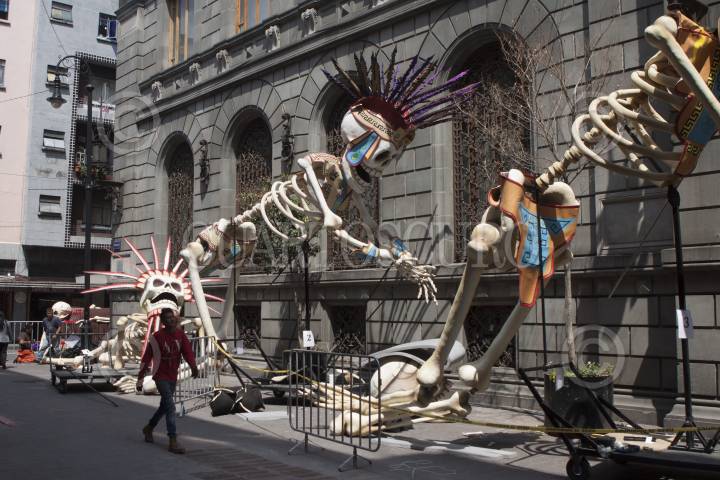 MÉXICO, D.F., 18MARZO2015.- Calaveras gigantes se han colocado en los alrededores de las calles de Tacuba, Donceles, Xicontétl y el callejón Marconi que se van a utilizar para la producción de la película del 007 la cual se va a realizar en la antigua sede del Senado. FOTO: MOISÉS PABLO /CUARTOSCURO.COM