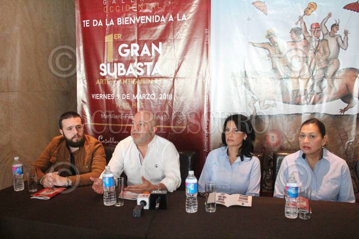 SAN LUIS POTOSÍ, S.L.P. 08MARZO2018.- La Galería Occidental representada por Zarehl y Gilberto Gutiérrez dieron a conocer en una conferencia de prensa la Primer Subasta de Arte y Antigüedades donde estarán obras de Máximo Javier, Rafael Coronel, David Alfaro Siqueiros, Rufino Tamayo, Francisco Toledo, Vladimir Cora, Javier Arévalo, Marcos Huerta y Joaquín Arias. El martillero será Paco de la Peña quien ha estado en muchas subastas en su carrera profesional. FOTO: MARCELO PALACIOS /CUARTOSCURO.COM