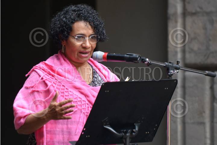 Edith Noyola, escritora y hermana de Samuel Noyola, poeta desaparecido, lee un fragmento de poema en en el marco del programa de actividades Octavio Paz de vuelta a San Ildefonso
