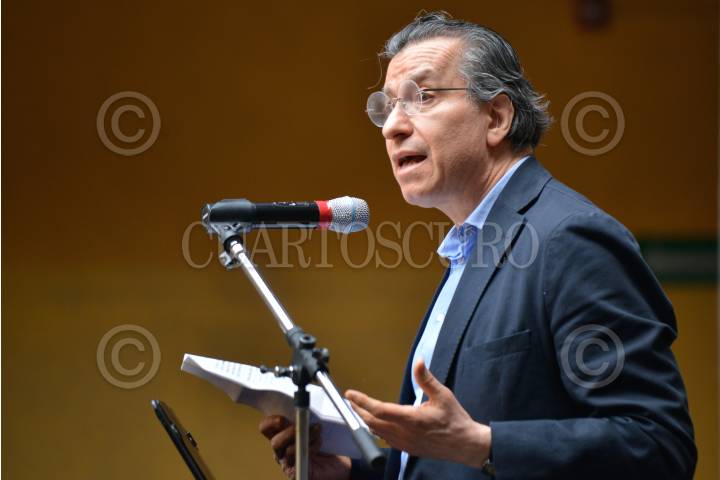 El poeta Adolfo Castañon, lee un fragmento de poema en en el marco del programa de actividades Octavio Paz de vuelta a San Ildefonso.