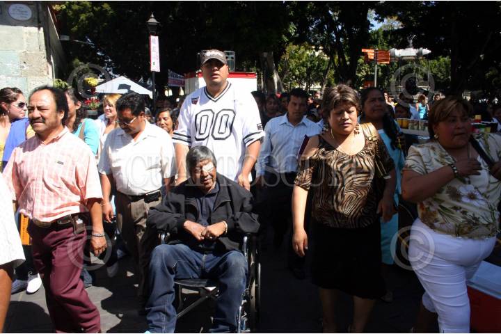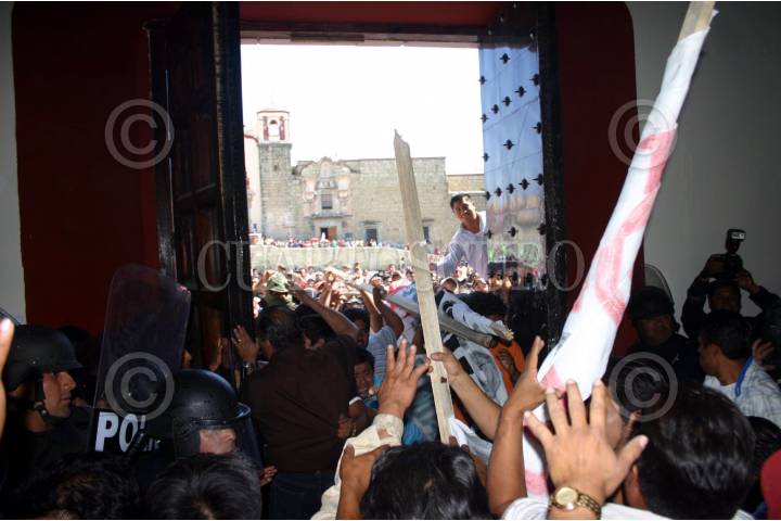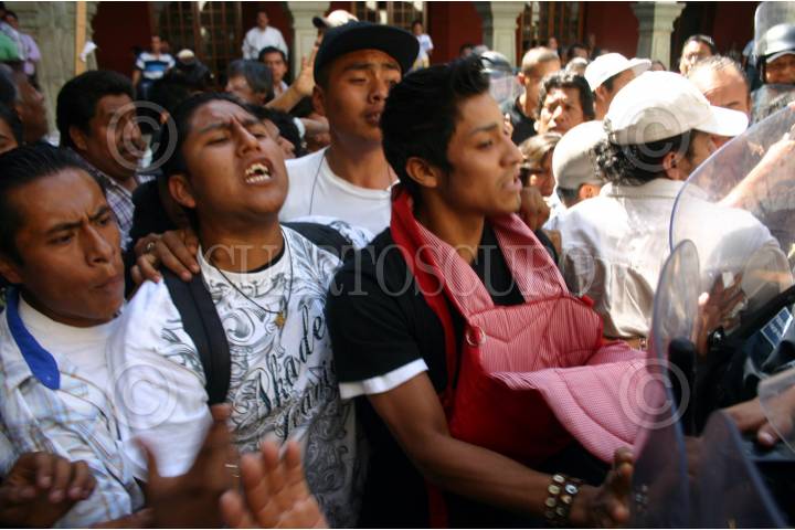 OAXACA, OAXACA, 28ENERO2009.- Alrededor de 500 comerciantes de diferentes zonas del estado, como la Central de Abasto, la Zona Seca y Riveras del Atoyac, salieron en una marcha masiva rumbo a la capital del Estado, su principal demanda es que sean liberados los espacios que por antigüedad les corresponde. Cuando los manifestantes llegaron a la entrada del Palacio Municipal un grupo antimotín de 50 policías les impidieron el paso, lo que causo su molestia así que intentaron abrirse paso entre empujones, palazos y manoteos para entrar a la sede municipal. Pudiendose llegar a un acuerdo de establecer una Meza de dialogo para el día de mañana. FOTO: MAX NÚÑEZ/CUARTOSCURO.COM