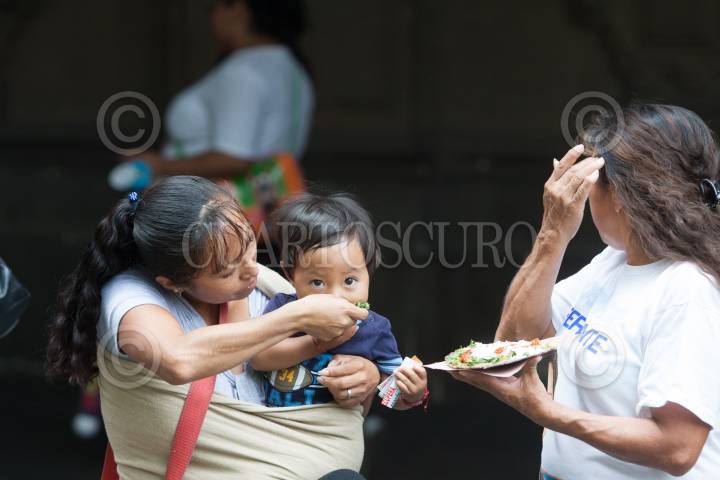 MÉXICO, D.F., 17AGOSTO2012.- Un pequeño prueba un tlayuda, una tortilla de maíz tostada acompañada de una salsa roja, queso y nopales, un antojito típico insalvable en una visita al Centro Histórico. FOTO: MOISÉS PABLO /CUARTOSCURO.COM