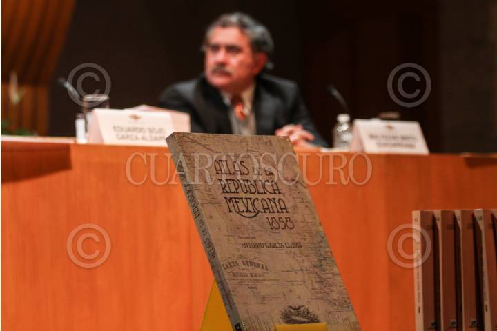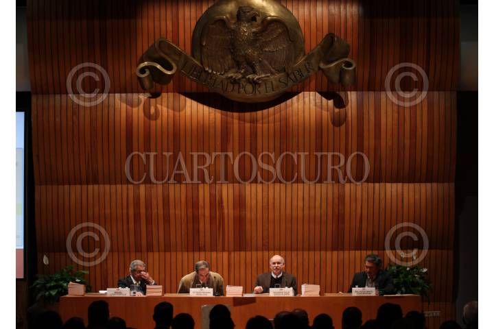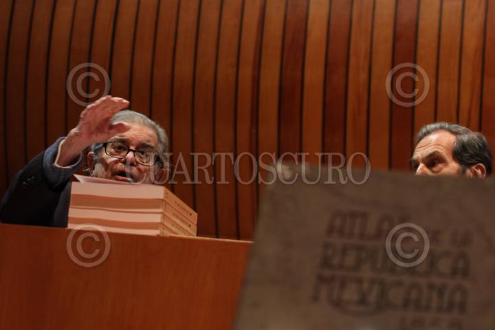 MÉXICO, D.F., 18DICIEMBRE2015.- El filósofo e historiador Miguel León Portilla presentó el "Atlas geográfico, estadístico e histórico de la República Mexicana" del historiador Antonio García Cubas, en el Colegio Nacional. La mesa de presentación estuvo conformada además por Octavio Novaro Peñalosa, Eduardo Sojo Garza-Aldape y Baltazar Brito Guadarrama. Al término de la presentación se rifaron algunos ejemplares del atlas entre el público asistente. FOTO: MARÍA JOSÉ MARTÍNEZ /CUARTOSCURO.COM