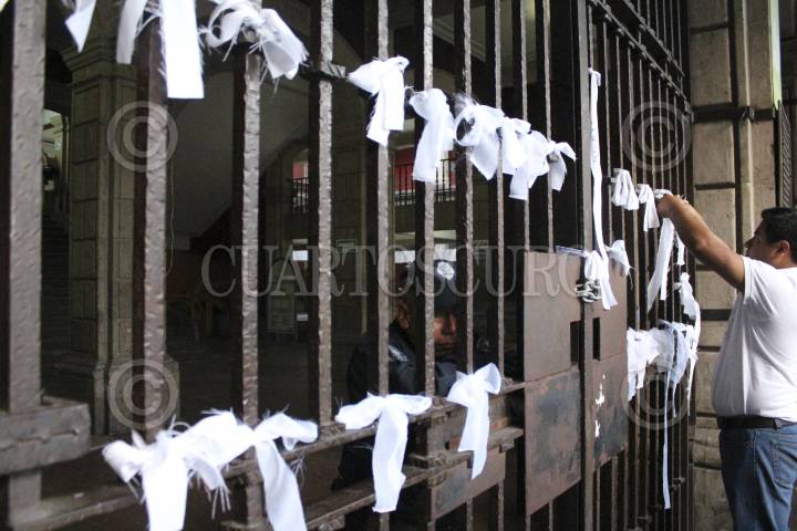 CUERNAVACA, MORELOS, 22OCTUBRE2014.- Un grupo de alumnos de la Universidad Autónoma del Estado de Morelos (UAEM) realizó una marcha del silencio por la paz a la que llamaron "Todos somos memoria". En la ofrenda de víctimas de Palacio de Gobierno, colocaron pancantas y velas, en las rejas de la entrada colocaron moños blancos como símbolo de paz. FOTO: PATRICIA MORALES /CUARTOSCURO.COM