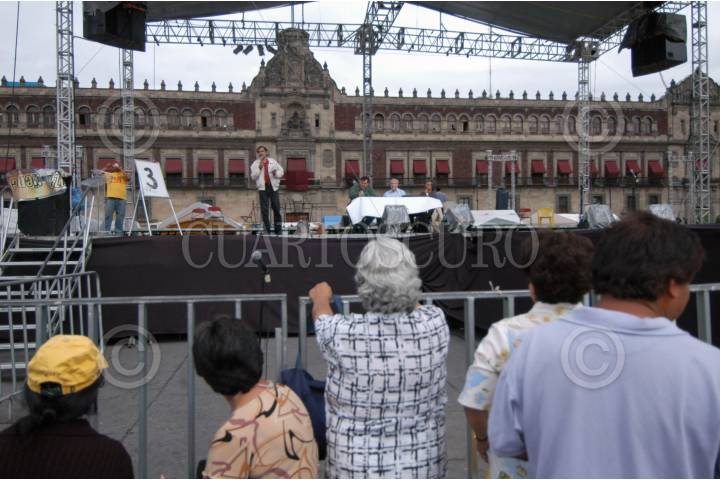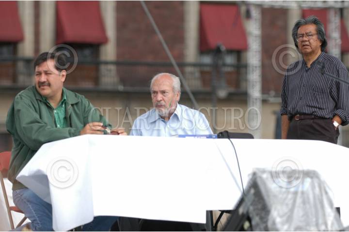 MÉXICO D.F. 13 SEPTIEMBRE 2006.- El vocero del PRD Gerardo Fernández Noroña, acompañado del investigador de la UAM Guillermo Almeida y el antropólogo Carlos San Juan, dio una conferencia sobre el futuro de la resistencia civil en el zócalo captalino. FOTO:CARLOS GUZMÁN/CUARTOSCURO.COM