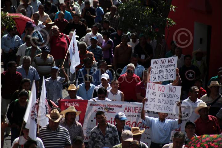CUERNAVACA, MORELOS, 27JULIO2018.- Militantes de la Asamblea Nacional de Usuarios de Energía Eléctrica (ANUEE) marcharon por las principales calles de la capital en protesta por las “jubilaciones doradas” que aprobó la legislatura 53 antes de irse de vacaciones y que benefician a funcionarios cercanos al gobernador. FOTO: MARGARITO PÉREZ RETANA /CUARTOSCURO.COM