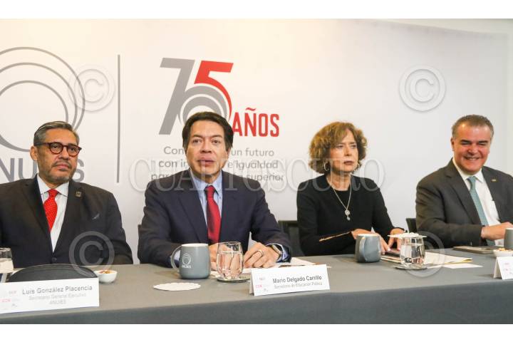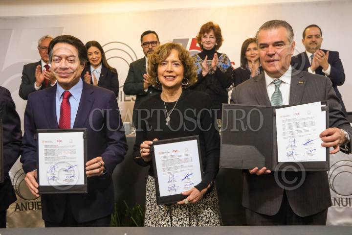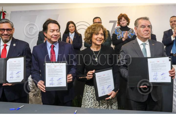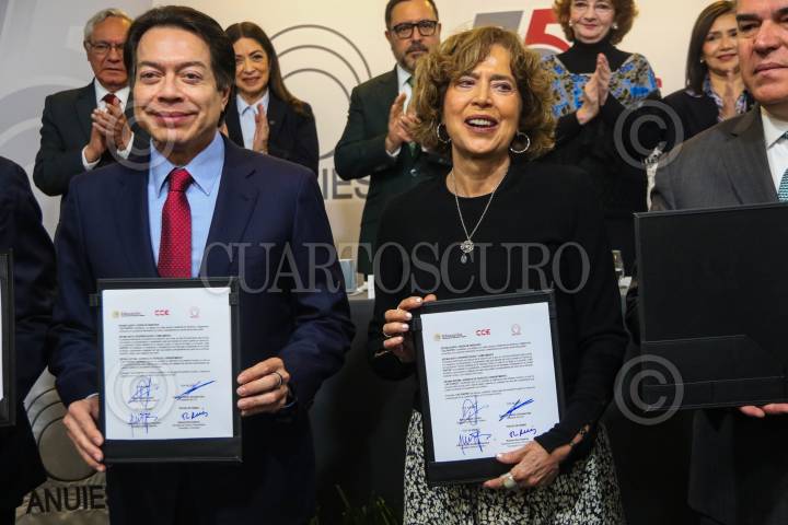 CIUDAD DE MÉXICO. 27ENERO2025.- Luis González, de Anuies, Mario Delgado de la SEP, Rosaura Ruiz y Francisco Cervantes del CCE, en la Firma del Acuerdo Nacional entre el Gobierno y el Sector Empresarial. FOTO: VICTORIA VALTIERRA/CUARTOSCURO.COM