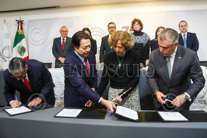 CIUDAD DE MÉXICO 16MAYO2025.- Luis González, secretario general ejecutivo ANUIES, Claudia Espino, secretaria ejecutiva del INE y María Cornejo, encabezaron el acto Protocolario de Firma del Convenio Específico de Colaboración con la Asociación Nacional de Universidades e Instituciones de Educación Superior de la República Mexicana A.C. (ANUIES), esto en la sede del instituto. FOTO: ROGELIO MORALES CUARTOSCURO.COM