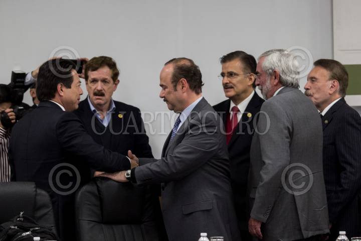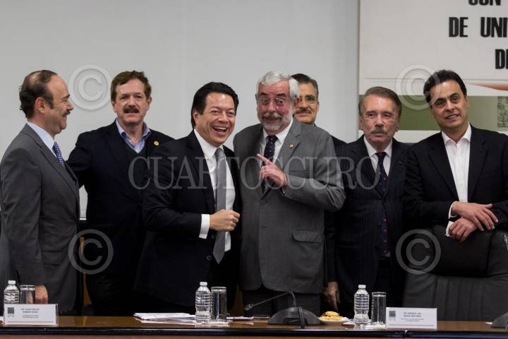 CIUDAD DE MÉXICO, 19DICIEMBRE2018.- Mario Delgado, coordinador morenista; Juan Carlos Romero Hicks, coordinador panista; Jaime Valls Esponda, secretario general ejecutivo de la Asociación Nacional de Universidades e Instituciones de Educación Superior (ANUIES); Tonatiuh Bravo, coordinador de Movimiento Ciudadano; Enrique Graue Wiechers, rector de la Universidad Nacional Autónoma de México (UNAM), y Mario Rodríguez Casas, director general del Instituto Politécnico Nacional (IPN), durante su participación, en la Cámara de Diputados, en la reunión con la Junta de Coordinación Política (JUCOPO) y ANUIES respecto al tema de recorte al presupuesto para universidades, propuesto en el paquete económico 2019. No obstante, el presidente Andrés Manuel López Obrador declaró, el día de ayer, que ya no se recortaría el gasto de las instituciones educativas. FOTO: GALO CAÑAS /CUARTOSCURO.COM