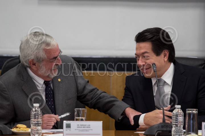 CIUDAD DE MÉXICO, 19DICIEMBRE2018.- Enrique Graue Wiechers, rector de la Universidad Nacional Autónoma de México (UNAM), y Mario Delgado, coordinador morenista, durante su participación, en la Cámara de Diputados, en la reunión con la Junta de Coordinación Política (JUCOPO) y ANUIES respecto al tema de recorte al presupuesto para universidades, propuesto en el paquete económico 2019. No obstante, el presidente Andrés Manuel López Obrador declaró, el día de ayer, que ya no se recortaría el gasto de las instituciones educativas. FOTO: GALO CAÑAS /CUARTOSCURO.COM
