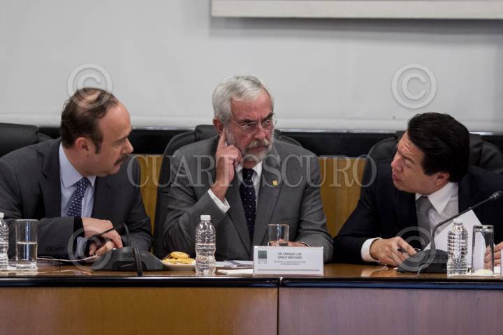 CIUDAD DE MÉXICO, 20AGOSTO2019.- David Colmenares Paramo, auditor Superior de la Federación; Enrique Graue Wiechers, rector de la UNAM, y el economista Dionisio Meade, durante la entrega de reconocimiento al rector por su labor frente a la máxima casa de estudios durante la sesión ordinaria del Consejo Nacional de la Asociación Nacional de Universidades e Instituciones de Educación Superior (ANUIES). FOTO: GRACIELA LÓPEZ /CUARTOSCURO.COM