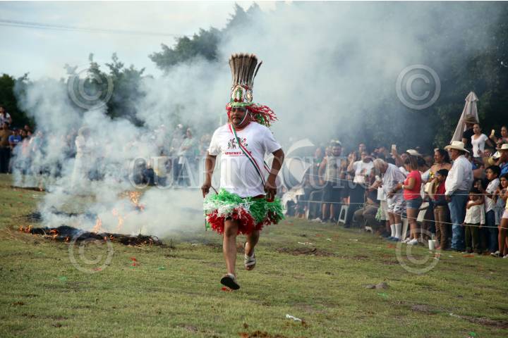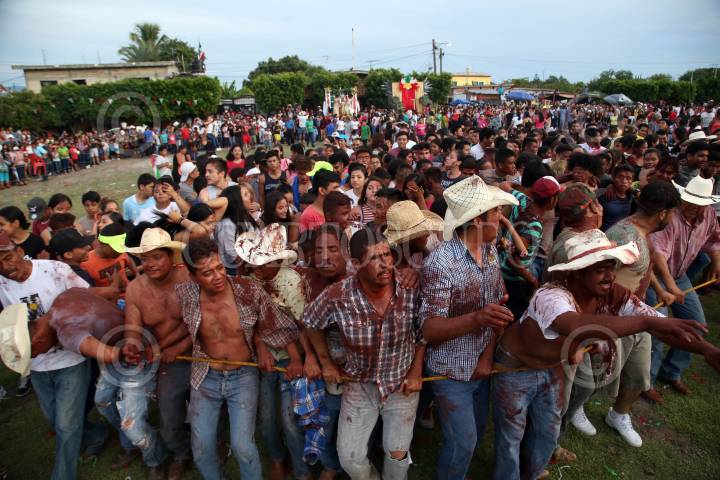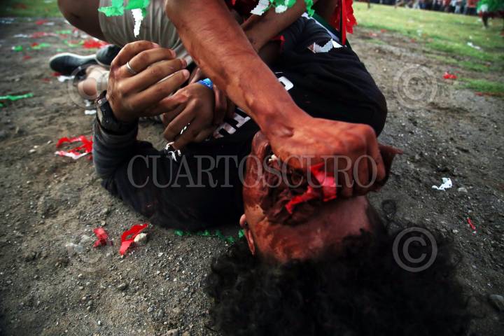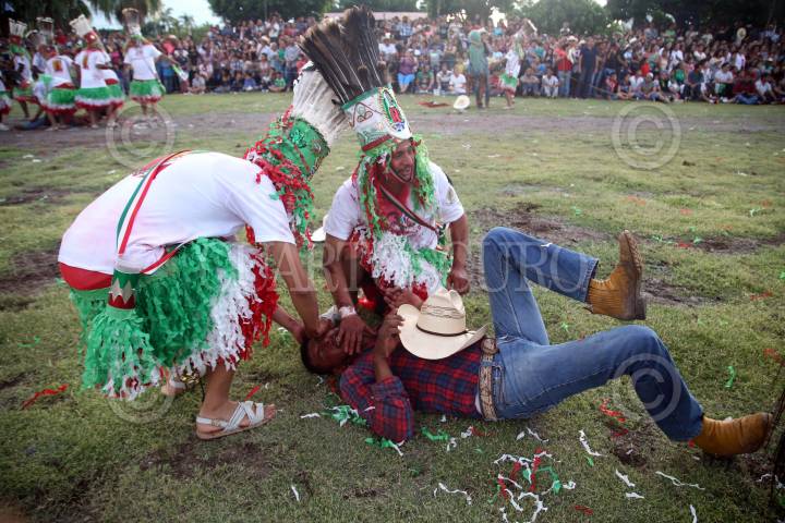 AXOCHIAPAN, MORELOS, 16SEPTIEMBRE2019.- Habitantes de la comunidad de Quebrantadero participan en la conmemoración por el 209 aniversario del Grito de Independencia. La representación se conoce como “Los Apaches” donde una parte de los pobladores se visten como indios y tienen que derribar de los caballos que montan los españoles, para después untar una mezcla de agua con tierra roja. FOTO: MARGARITO PÉREZ RETANA /CUARTOSCURO.COM