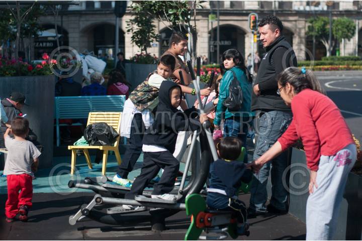 MÉXICO, D.F., 29DICIEMBRE2014.- Un grupo de niños disfrutan la temporada vacacional de invierno ejercitándose en el Parque de Bolsillo, ubicado en el primer cuadro de la ciudad. Los parques de bolsillo son espacios públicos menores a 400 metros cuadrados que fueron rescatados a partir de vialidades y predios en desuso. FOTO: DIEGO SIMÓN SÁNCHEZ /CUARTOSCURO.COM