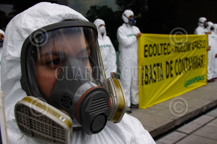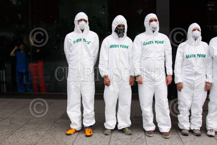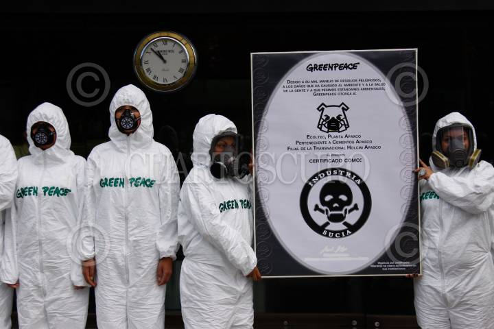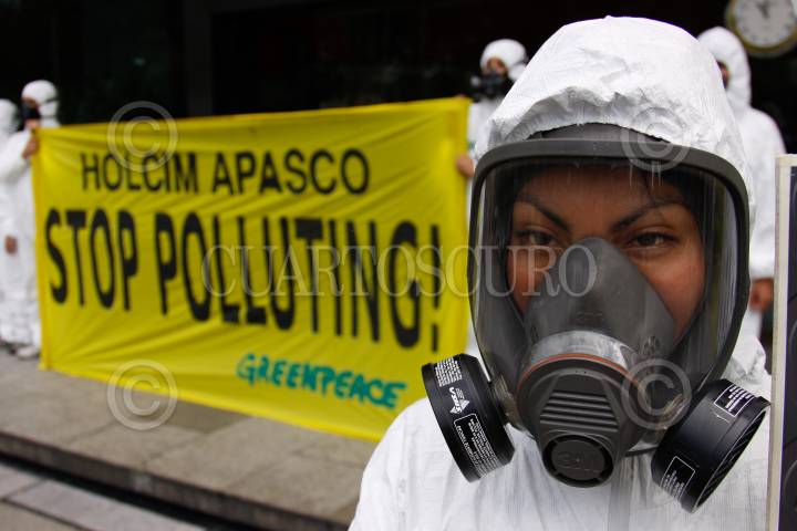 MÉXICO, D.F., 15JULIO2010.- La organización ambientalista Greenpeace se manifestó frente a las oficinas coorporativas de la empresa Holchim-Apasco-Ecoltec para certificar a la empresa como una industria sucia debido a las emanaciones tóxicas, el mal manejo de residuos peligrosos y a las afectaciones a la salud de los habitantes de los municipios de Apaxco y Atotonilco de Tula. FOTO: IVAN STEPHENS/CUARTOSCURO.COM