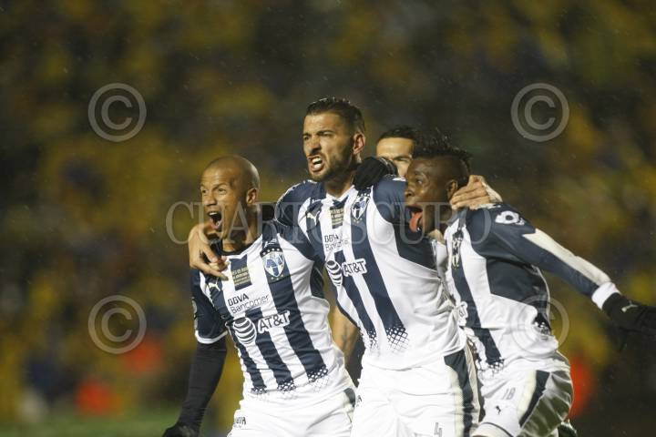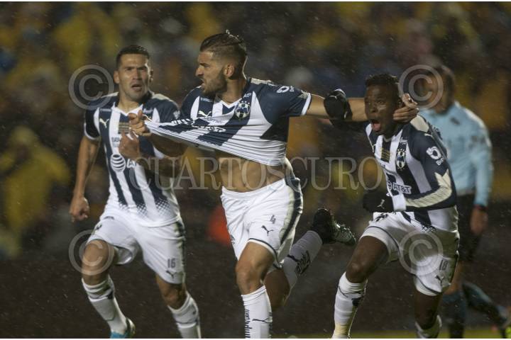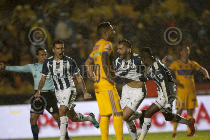 MONTERREY, NUEVO LEÓN, 07DICIEMBRE2017.- Jugadores del equipo de los Rayados del Monterrey, celebran el gol ante el equipo de los Tigres de la UANL, en el estadio Universitario, partido correspondiente a la final de ida de la Liguilla, Apertura 2017. Marcador Final: Tigres: 1 - Monterrey: 1 FOTO: GABRIELA PÉREZ MONTIEL /CUARTOSCURO.COM