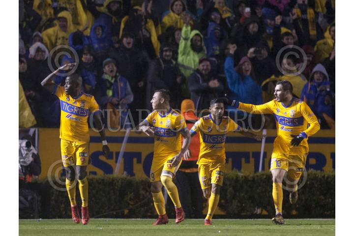 MONTERREY, NUEVO LEÓN, 07DICIEMBRE2017.- Jugadores del equipo de los Tigres de la UANL celebran el gol ante el equipo de los Rayados del Monterrey, en el estadio Universitario, partido correspondiente a la final de ida de la Liguilla, Apertura 2017. Marcador Final: Tigres: 1 - Monterrey: 1 FOTO: GABRIELA PÉREZ MONTIEL /CUARTOSCURO.COM