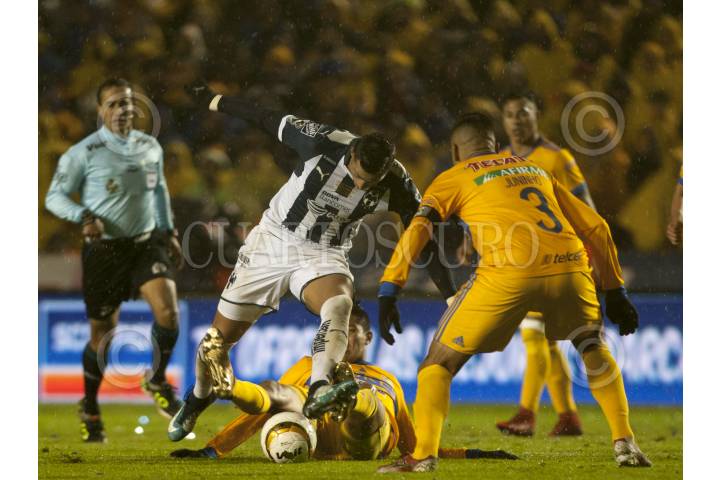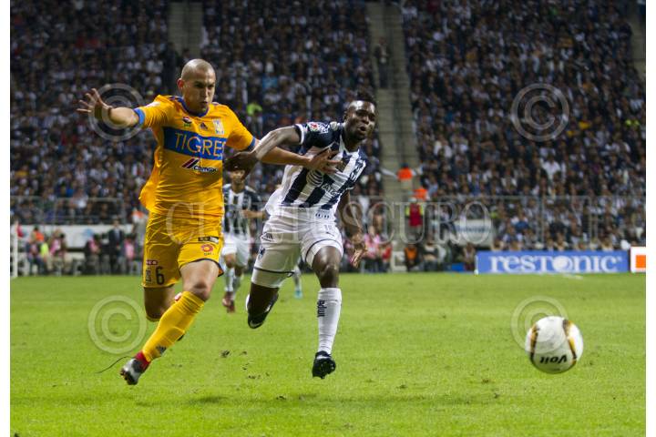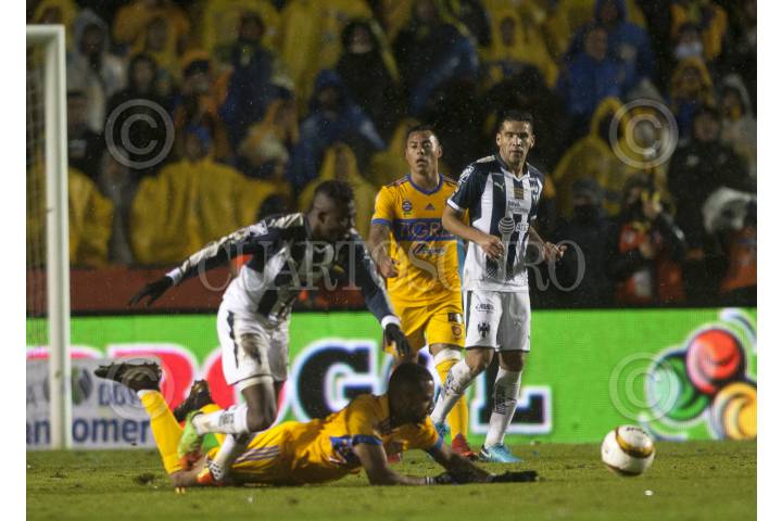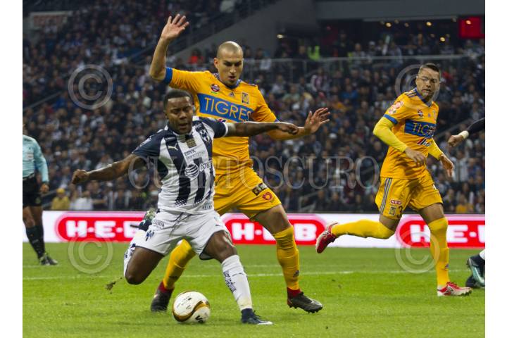 MONTERREY, NUEVO LEÓN, 07DICIEMBRE2017.- Enner Valencia del equipo de los Tigres de la UANL se disputa el balón con Avilés Hurtado del equipo de los Rayados del Monterrey, en el estadio Universitario, partido correspondiente a la final de ida de la Liguilla, Apertura 2017. Marcador Final: Tigres: 1 - Monterrey: 1 FOTO: GABRIELA PÉREZ MONTIEL /CUARTOSCURO.COM