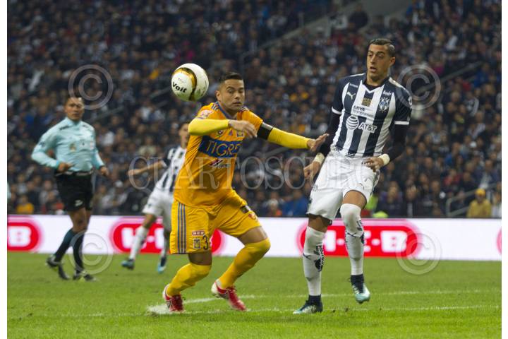 MONTERREY, NUEVO LEÓN, 10DICIEMBRE2017.- Avilés Hurtado del equipo de los Rayados del Monterrey se disputa el balón con Jorge Torres Nilo del equipo de los Tigres de la UANL, en el estadio BBVA Bancomer, partido final de vuelta de la Liguilla, Apertura 2017. Marcador al Medio Tiempo: Monterrey: 1 - Tigres: 2 FOTO: GABRIELA PÉREZ MONTIEL /CUARTOSCURO.COM