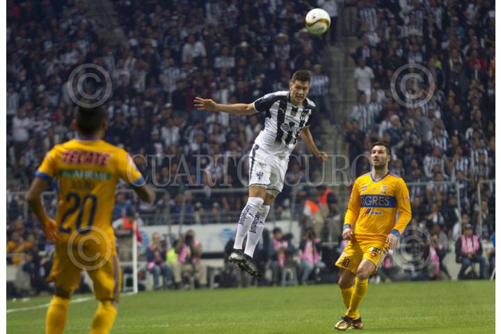 MONTERREY, NUEVO LEÓN, 10DICIEMBRE2017.- Hiram Mier del equipo de los Rayados del Monterrey se disputa el balón con André-Pierre Gignac del equipo de los Tigres de la UANL, en el estadio BBVA Bancomer, partido final de vuelta de la Liguilla, Apertura 2017. Marcador al Medio Tiempo: Monterrey: 1 - Tigres: 2 FOTO: GABRIELA PÉREZ MONTIEL /CUARTOSCURO.COM