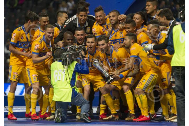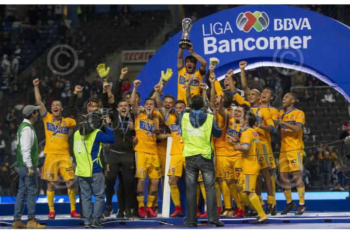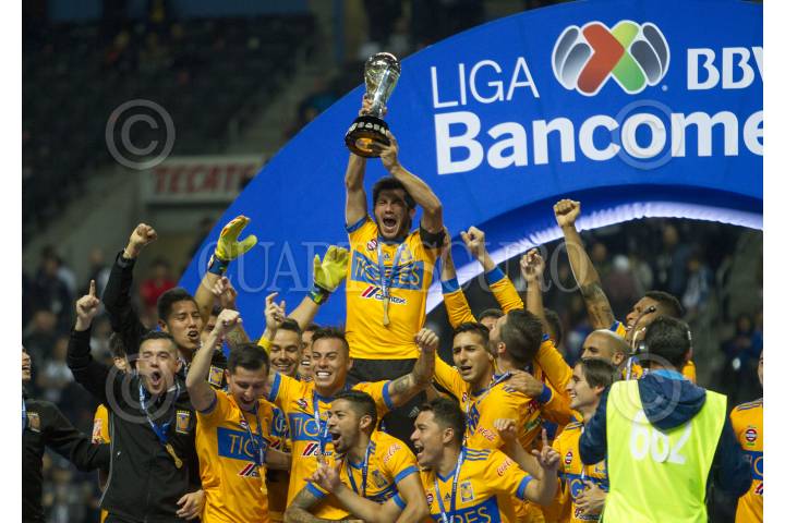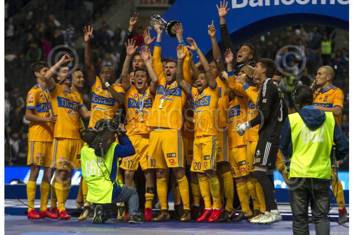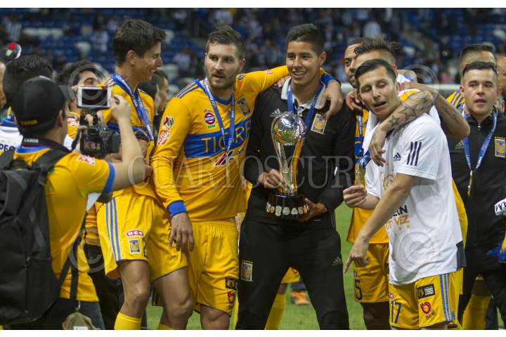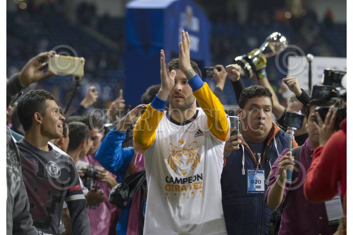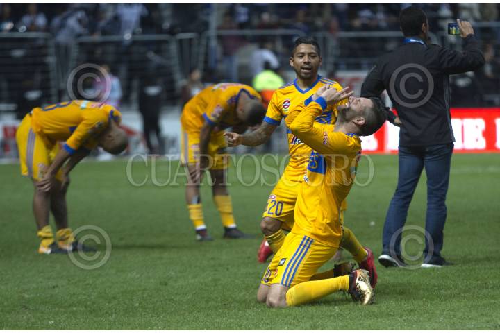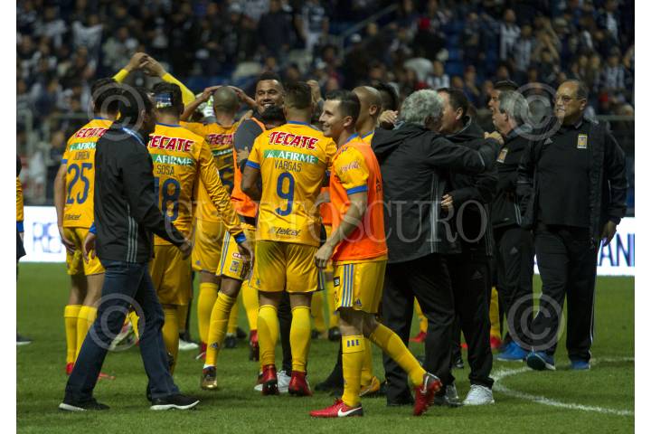 MONTERREY, NUEVO LEÓN, 10DICIEMBRE2017.- Jugadores del equipo de los Tigres de la UANL celebran el triunfo, en el estadio BBVA Bancomer, partido disputado contra los Rayados del Monterrey de la Liguilla, Apertura 2017. Marcador Global: Monterrey: 2 - Tigres: 3 FOTO: GABRIELA PÉREZ MONTIEL /CUARTOSCURO.COM