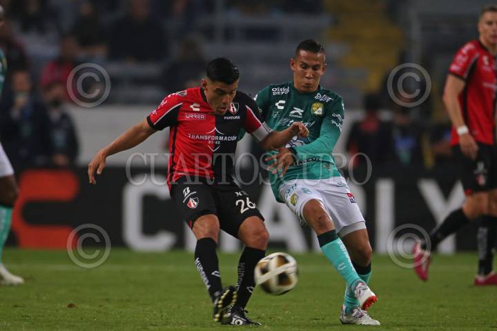 Julián Quiñonez jugador de Atlas, disputa un balón frente al contrario de León, José Rodríguez, esto durante el juego correspondiente a la final del Torneo Grita México Apertura 2021 de la Liga MX.