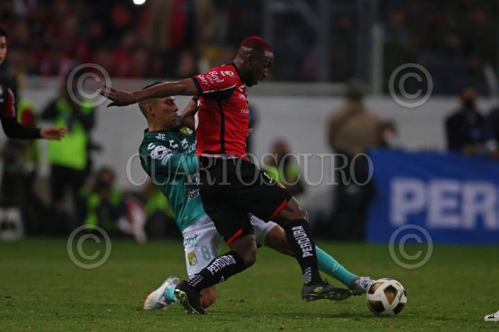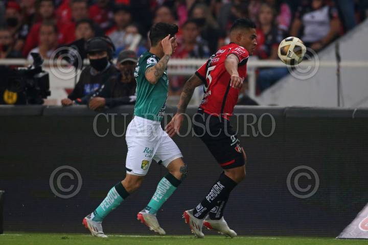 Anderson Santamaría jugador de Atlas, disputa un balón frente al contrario de León, , esto durante el juego correspondiente a la final del Torneo Grita México Apertura 2021 de la Liga MX.