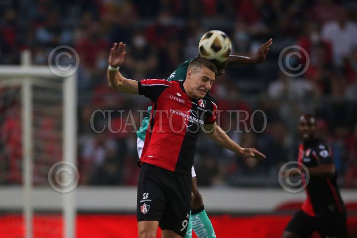 Julio Furch jugador de Atlas, disputa un balón frente al contrario de León, Stiven Barreiro, esto durante el juego correspondiente a la final del Torneo Grita México Apertura 2021 de la Liga MX.