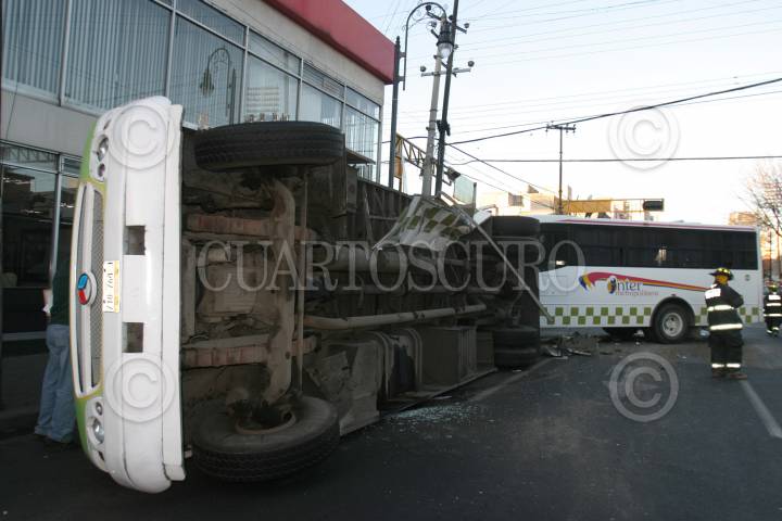 TOLUCA, ESTADO DE MÉXICO, 04DICIEMBRE2009.- En punto de las 06:15 de esta mañana ocurrió un accidente entre dos autobuses de pasajeros en donde 16 personas salieron lesionadas y una mujer murió. Esta quedo aplastada por la unidad que se volteo, lo que provoco que cerraran varias calles en el centro de la ciudad para las maniobras de rescate. FOTO: EMILIO VARELA/CUARTOSCURO.COM