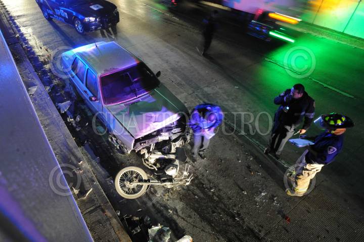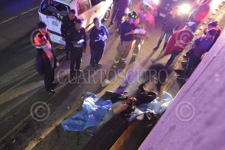 MÉXICO, D.F., 15AGOSTO2015.- Un hombre de aproximadamente 50 años, perdió la vida aplastado por dos vehículos sobre circuito Interior a la altura de Calzada de Guadalupe, Cuando este, empujaba a un auto Atos que había descompuesto en carriles centrales, siendo impactados por un Jetta a toda velocidad. El conductor de este se dio a la fuga abandonando el vehículo en el lugar. FOTO: LUIS CARBAYO /CUARTOSCURO.COM