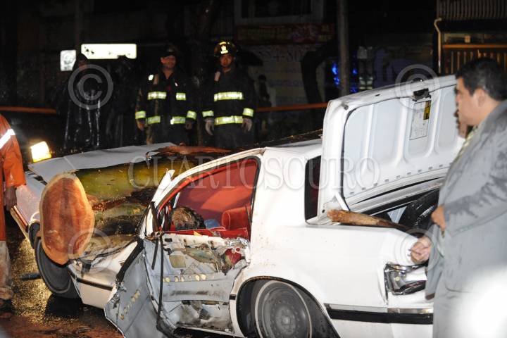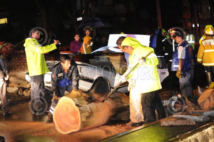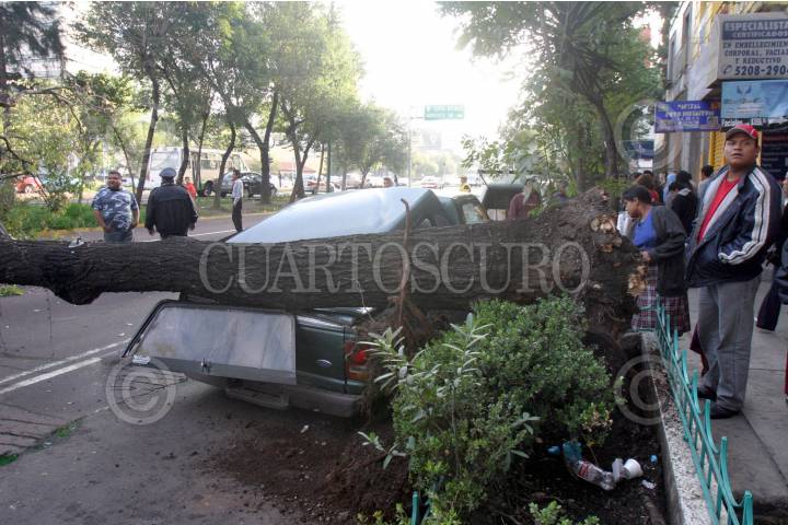 MÉXICO, D.F., 26AGOSTO2011.- Una pareja de 40 y 50 años aproximadamente pierden la vida al caerles encima un árbol de aproximadamente 30 metros de altura cuando viajaban abordo de su auto en avenida Eje 10 Sur Copilco a la altura de avenida Universidad en la colonia Copilco en la delegación Coyoacan. Las fuertes lluvias que se registraron durante la tarde noche, ocasionaron que se debilitara las raíces cayendo sobre el auto en el que viajaban la pareja. Más de tres horas laboraron elementos de emergencia para liberar los cuerpos. FOTO: LUIS CARBAYO/CUARTOSCURO.COM