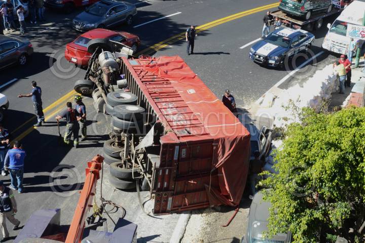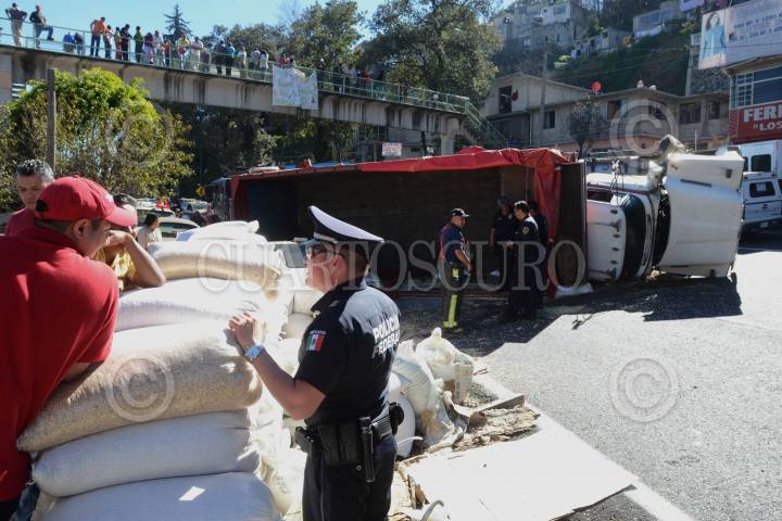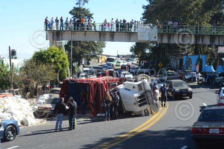 MÉXICO D,F; 21DICIEMBRE2013.- Un camión tipo Torton, volcó aplastando dos vehículos que circulaban cerca de este en el Km. 23 de la carretera federal México Cuernavaca en el poblado de San Andrés Totoltepec. FOTO: LUIS CARBAYO /CUARTOSCURO.COM