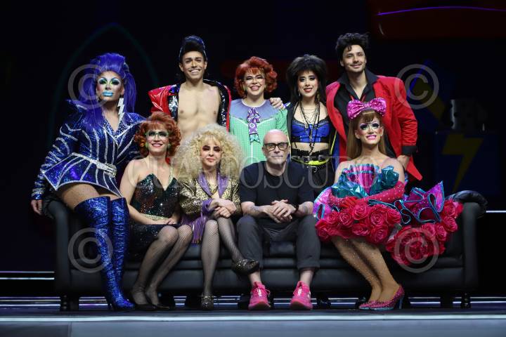 Parte del elenco y el productor Oscar Carnicero durante la presentación de la aplicación para teléfonos inteligentes de la producción de Mentiras, que comprende Mentiras el Musical, el Concierto y Mentidrags; en el Teatro Aldama.