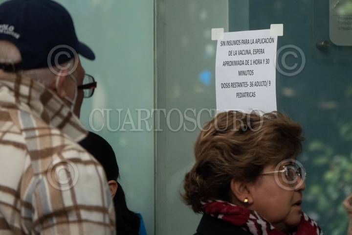 CIUDAD DE MÉXICO, 20DICIEMBRE2023.- Un letrero con la leyenda "Sin insumos para aplicación de la vacuna" se lee mientras personas realizan una fila en un consultorio de la Farmacia San Pablo para la aplicación de la vacuna Covid-19 que a partir de hoy comenzó su venta en dichos establecimientos. Las otras tres cadenas que podrán venderlas son Benavides, Guadalajara y Del Ahorro. FOTO: GALO CAÑAS/CUARTOSCURO.COM