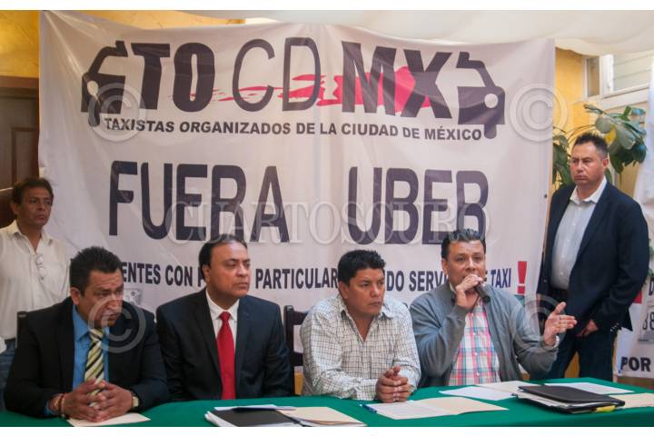 MÉXICO, D.F., 04MAYO2015.- Ignacio Rodríguez, Francisco Cornejo, Daniel Medina y José Luis Ramírez, voceros de la organización Taxistas Organizados de la Ciudad de México, ofrecieron una conferencia de prensa para postular su rechazo ante la posibilidad de que los servicios de transporte individual que operan con aplicaciones móviles, como Uber y Cabify, sean regulados bajo un esquema de control equitativo respecto al sector concesionado. FOTO: DIEGO SIMÓN SÁNCHEZ /CUARTOSCURO.COM