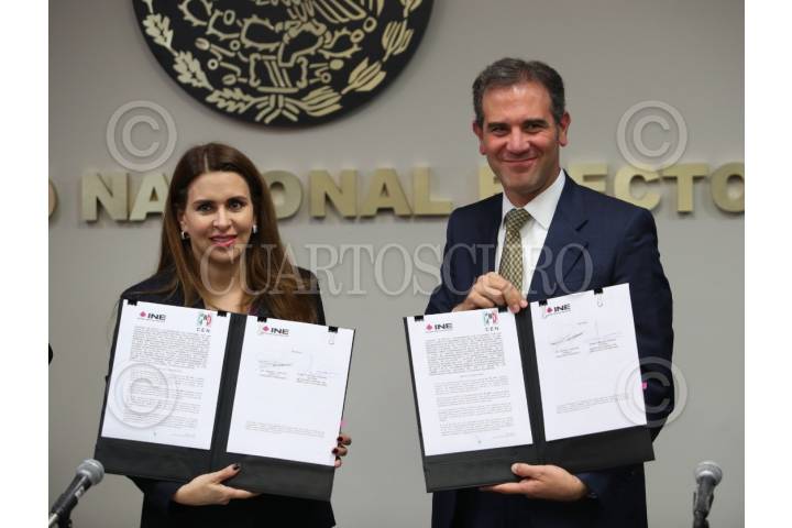 CIUDAD DE MÉXICO, 09OCTUBRE2019.- Carolina Viggiano, secretaria del PRI, y Lórenzo Córdova, presidente del INE, durante la firma de convenio INE-PRI para el uso de la aplicación móvil para la afiliación de militantes. FOTO: INE /CUARTOSCURO.COM