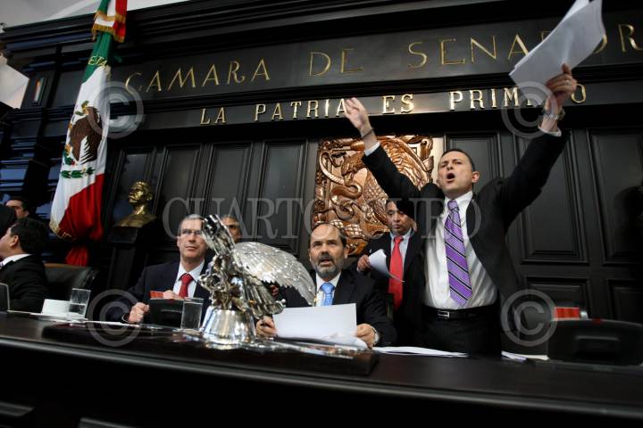 MÉXICO, D.F., 02ABRIL2009.- El senador Fernando Castro Trenti protesta desde la tribuna durante la sesión en el Senado, donde se aprobó la Ley de Extinción de Dominio. FOTO: PAN SENADO/CUARTOSCURO.COM