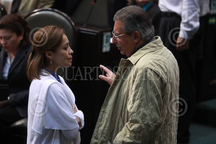 MÉXICO, D.F., 17NOVIEMBRE2009.- El coordinador de los diputados priísita, Francisco Rojas, conversa con la coordinadora de la bancada panista Josefina Vazquez Mota, durante la sesion en la Cámara de Diputados donde con 437 votos a favor, 25 en contra y 4 abstenciones, el Pleno de la Cámara de diputados aprobó en lo general el Presupuesto de Egresos para 2010. FOTO: SÁSHENKA GUTIÉRREZ/CUARTOSCURO.COM