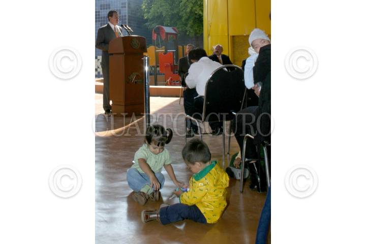 México, D. F. 30 Abril 2004.- Un par de niños juegan mientras el presidente Vicente Fox lee el informe anual 2003 de un México apropiado para la infancia y la adolescencia que se llevó a cabo en el papalote museo del niño. FOTO: Nelly Salas/CUARTOSCURO.COM