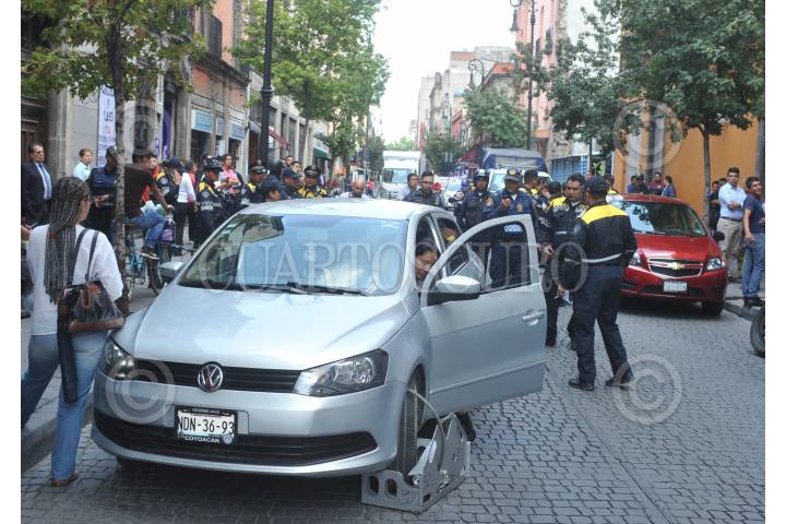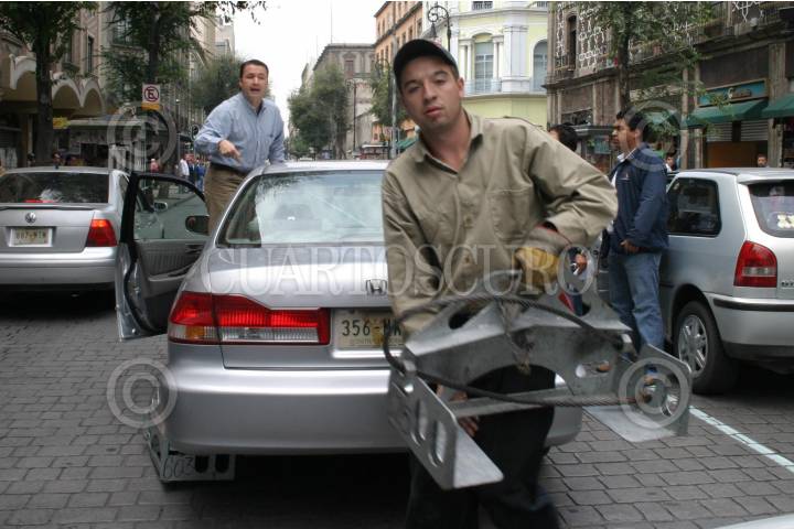 MEXICO, D.F. 08OCTUBRE2004.- Un conductor que circulaba por la avenida 5 mayo fue sorprendido por trabajadores que colocan inmovilizadores, interceptaron su vehículo y en medio del tráfico le colocaron una "araña". FOTO: Nelly Salas/CUARTOSCURO.COM