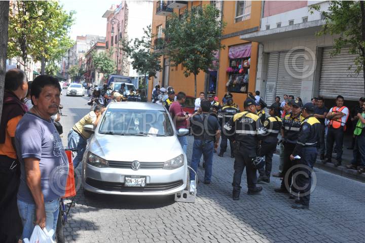 CIUDAD DE MÉXICO, 20SEPTIEMBRE2018.- Se suscitó una bronca entre dos automovilistas contra policías de transito luego de fueron multados y sus autos fueron inmovilizados por las llamadas "arañas". Los hechos cuando las unidades fueron infraccionadas en la calle de Mesones, entre 5 de Febrero y Bolívar, los afectados se hicieron de palabra con los uniformados, quienes intentaron detener a un conductor que se refugió en una plaza cercana, para evitarlo. FOTO: ARMANDO MONROY /CUARTOSCURO.COM