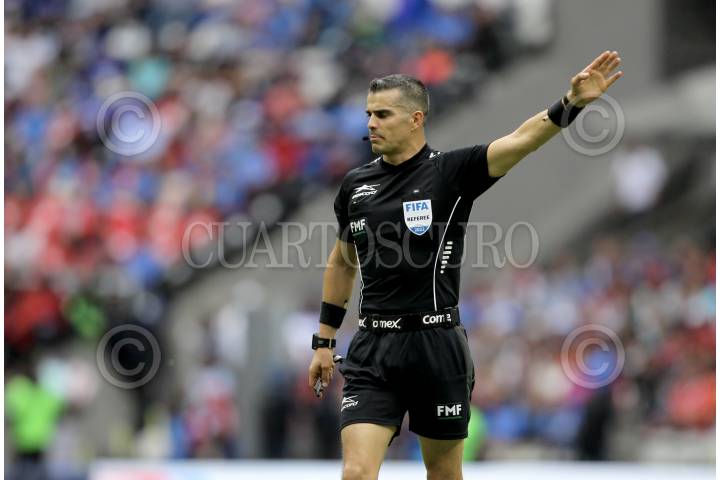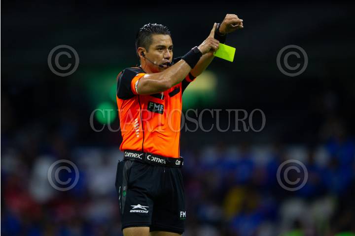 El árbitro central Fernando Hernández durante el partido de fútbol Cruz Azul vs Toluca correspondiente a la jornada 8 del Torneo Apertura 2022 de Liga BBVA MX, en el estadio Azteca.