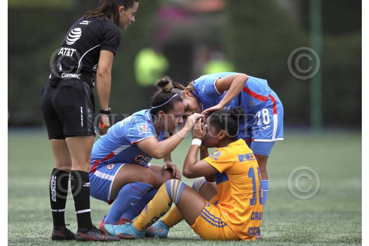 La árbitro Karol Hernández y las jugadoras Belén Cruz y Ana García durante el partido de fútbol Cruz Azul vs Tigres correspondiente a la jornada 2 del Torneo Apertura 2022 de Liga BBVA MX Femenil, en instalaciones de La Noria.