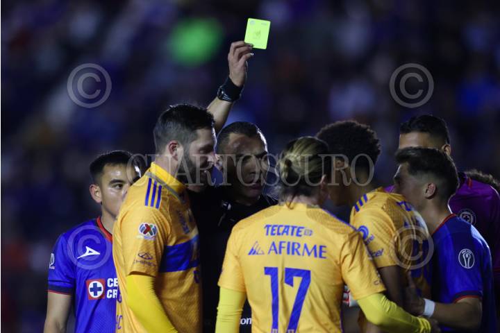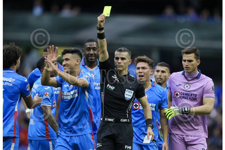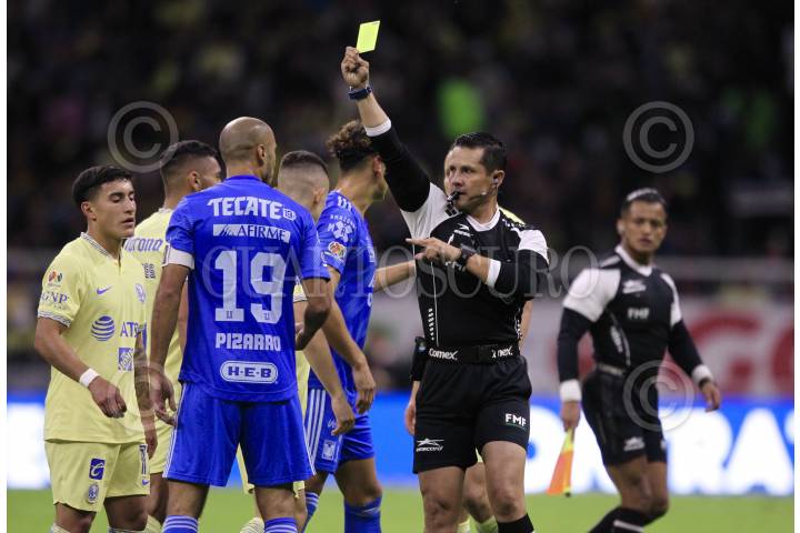 CIUDAD DE MÉXICO, 17FEBRERO2024. El Árbitro Central Marco Antonio Ortiz Nava muestra tarjeta amarilla a jugadores de tigres durante el partido de fútbol Cruz Azul vs Tigres correspondiente a la jornada 7 del Torneo Clausura 2024 de Liga BBVA MX, en el Estadio Ciudad de los Deportes. FOTO: EDGAR NEGRETE LIRA/CUARTOSCURO.COM