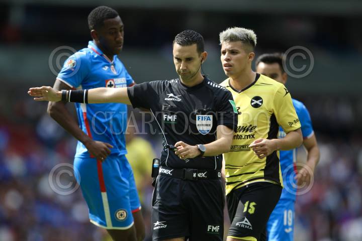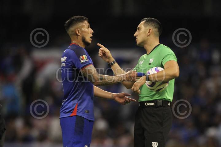 CIUDAD DE MÉXICO, 12JULIO2025. El Árbitro Central, Maximiliano Quintero Hernández repartió 6 tarjetas amarillas durante el partido de fútbol Cruz Azul vs Mazatlán correspondiente a la jornada 1 del Torneo Apertura 2025 de Liga BBVA MX, en el Estadio Olímpico Universitario. FOTO: EDGAR NEGRETE LIRA/CUARTOSCURO.COM
