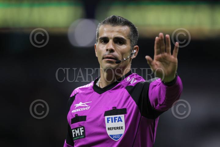 Árbitro Central Luis Enrique Santander durante el partido de fútbol América vs FC Juárez correspondiente a la jornada 7 del Torneo Apertura 2022 de Liga BBVA MX, en el estadio Azteca.