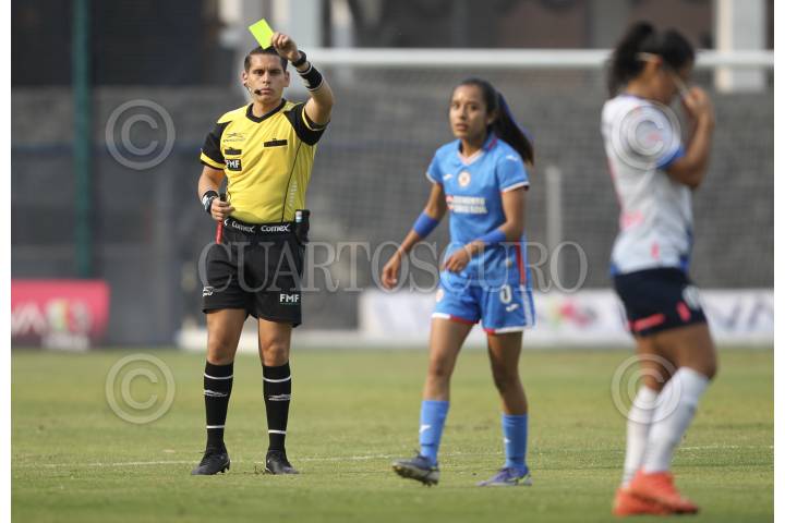 El árbitro central Jesús Enrique Herrera amonesta a una jugadora durante el partido de fútbol Cruz Azul vs Monterrey correspondiente a la jornada 6 del Torneo Clausura 2023 de Liga BBVA MX Femenil, en instalaciones de La Noria.