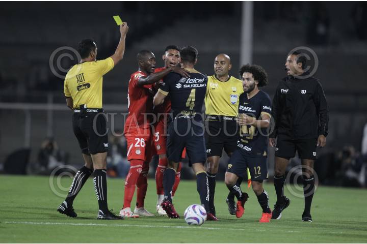 El Árbitro Central Luis Enrique Santander muestra tarjeta amarilla los jugadores Tomas Belmonte de Toluca y César Huerta de Pumas tras un conato de bronca durante el partido de fútbol Pumas vs Toluca correspondiente a la jornada 4 del Torneo Apertura 2023 de Liga BBVA MX, en el estadio Olímpico Universitario.