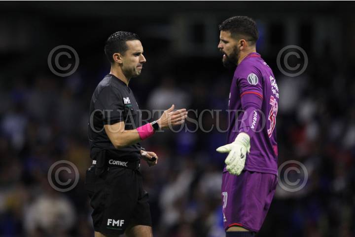 CIUDAD DE MÉXICO, 07OCTUBRE2023. El Árbitro Central César Arturo Ramos discute con el portero del Cruz Azul, Andrés Gudiño marcando la repetición del tiro penal a favor de Pumas durante el partido de fútbol Cruz Azul vs Pumas correspondiente a la jornada 12 del Torneo Apertura 2023 de Liga BBVA MX en el Estadio Azteca. FOTO: EDGAR NEGRETE/CUARTOSCURO.COM