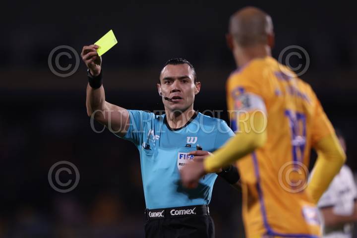 CIUDAD DE MÉXICO, 07DICIEMBRE2023. El Árbitro Central Marco Antonio Ortiz Nava muestra una tarjeta amarilla durante el partido de fútbol Pumas vs Tigres correspondiente a la semifinal de ida del Torneo Apertura 2023 de Liga BBVA MX, en el Estadio Olímpico Universitario. FOTO: EDGAR NEGRETE/CUARTOSCURO.COM