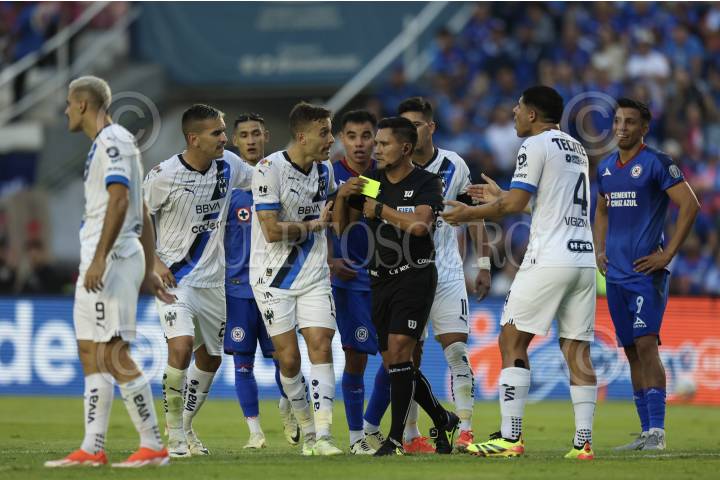 CIUDAD DE MÉXICO, 19MAYO2024. El Árbitro Central Fernando Guerrero discute con jugadores de Rayados tras amonestar a uno durante el partido de fútbol Cruz Azul vs Monterrey correspondiente a la semifinal de vuelta del Torneo Clausura 2024 de la Liga BBVA MX, en el Estadio Ciudad de los Deportes. FOTO: EDGAR NEGRETE LIRA/CUARTOSCURO.COM